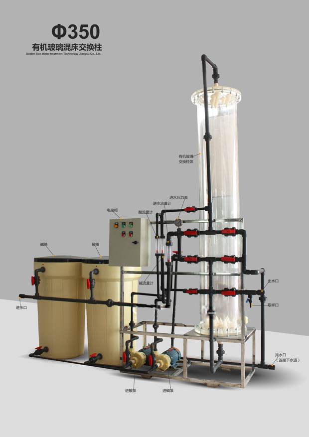 离子交换装置主要用于水的处理净化,将原水中的各种离子胶原体等杂质去除。近年来,随着科学的发展该设备不断的扩大使用领域如:制酒业中的葡萄酒汁的净化、生物工程化工制剂、大专院校、科学院及试验室的各种液体的净化。